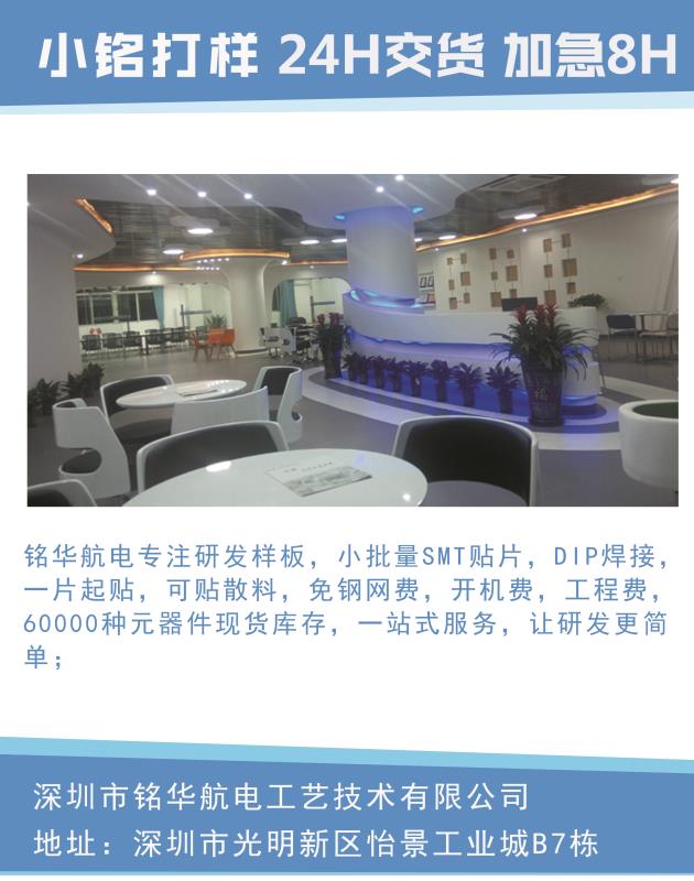 銘華航電是一家專業(yè)為電子行業(yè)創(chuàng)新型研發(fā)公司服務的平臺,我們提供包括研發(fā)方案平臺、物料選型、樣板制作、小批量制作、檢測等服務內容,提 升研發(fā)效益。